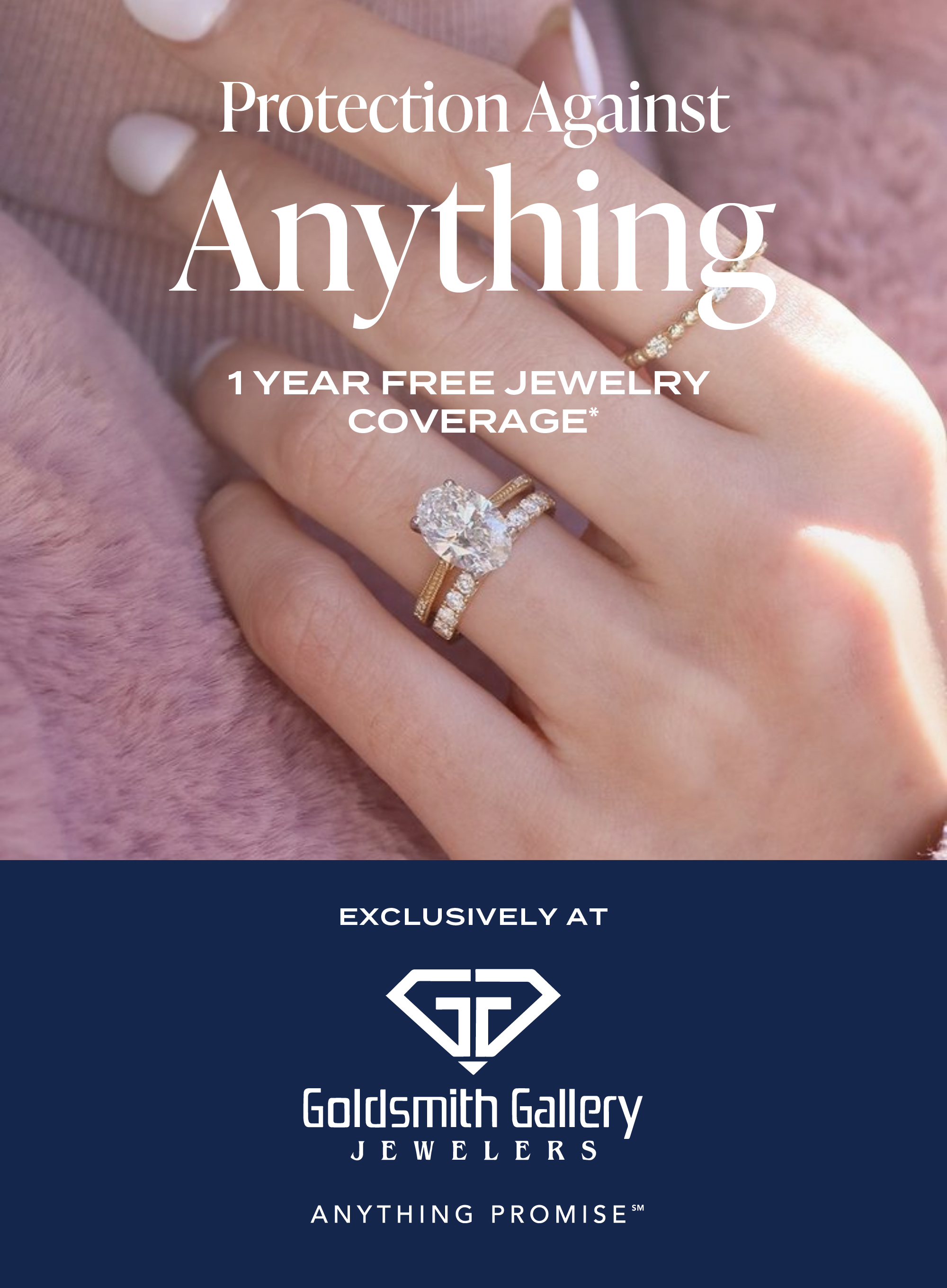 Anything means ANYTHING. When you choose Goldsmith Gallery Jewelers you’re choosing more than a beautiful piece, you’re choosing peace of mind against anything that happens. The Anything Promise is crafted to offer you unparalleled peace of mind- far beyond the typical warranty. When you purchase any bridal jewelry from Goldsmith Gallery Jewelers, we provide much more than just a warranty. The Anything Promise includes a detailed care plan designed to keep your ring in pristine condition for years to come. Not only will we clean and inspect your jewelry regularly, but our comprehensive guarantee covers everything- yes, EVERYTHING- from routine repairs to unexpected loss, ensuring that all maintenance and replacement needs are fully covered during the first year. Lose a diamond—regardless of the cause? We’ll replace it, no questions asked. You’re not just getting a warranty; you’re getting expert care and true protection for your most cherished possession.